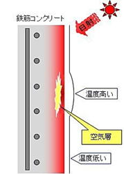 ■剥離すると、内部に空気層が出来る ■空気層は大きな断熱性を持っている ■うき・剥離の部分では剥離部裏面の空気層が熱を伝えにくい ■健全部に比較して表面温度の変動が大きくなる ■日射があたったり外気温が上昇 ■健全部より高温になる